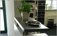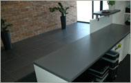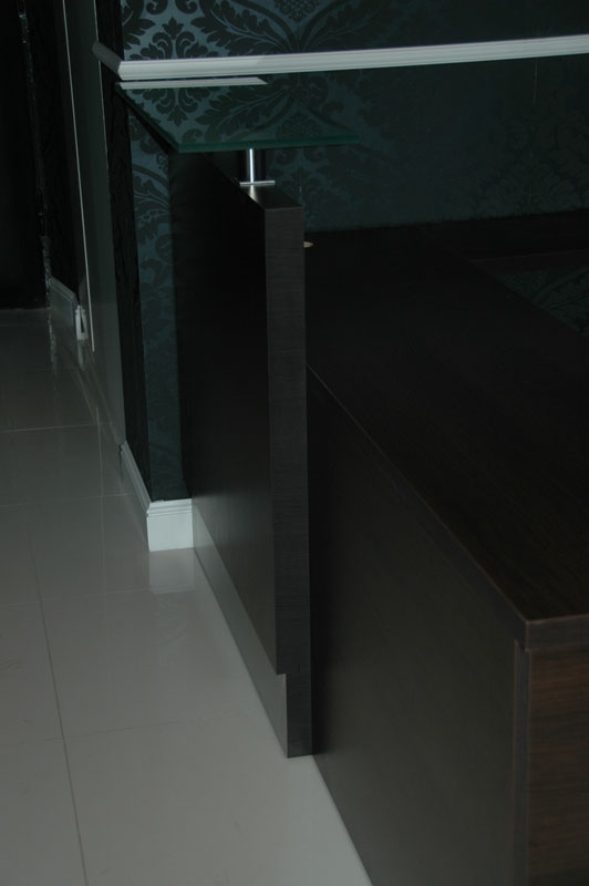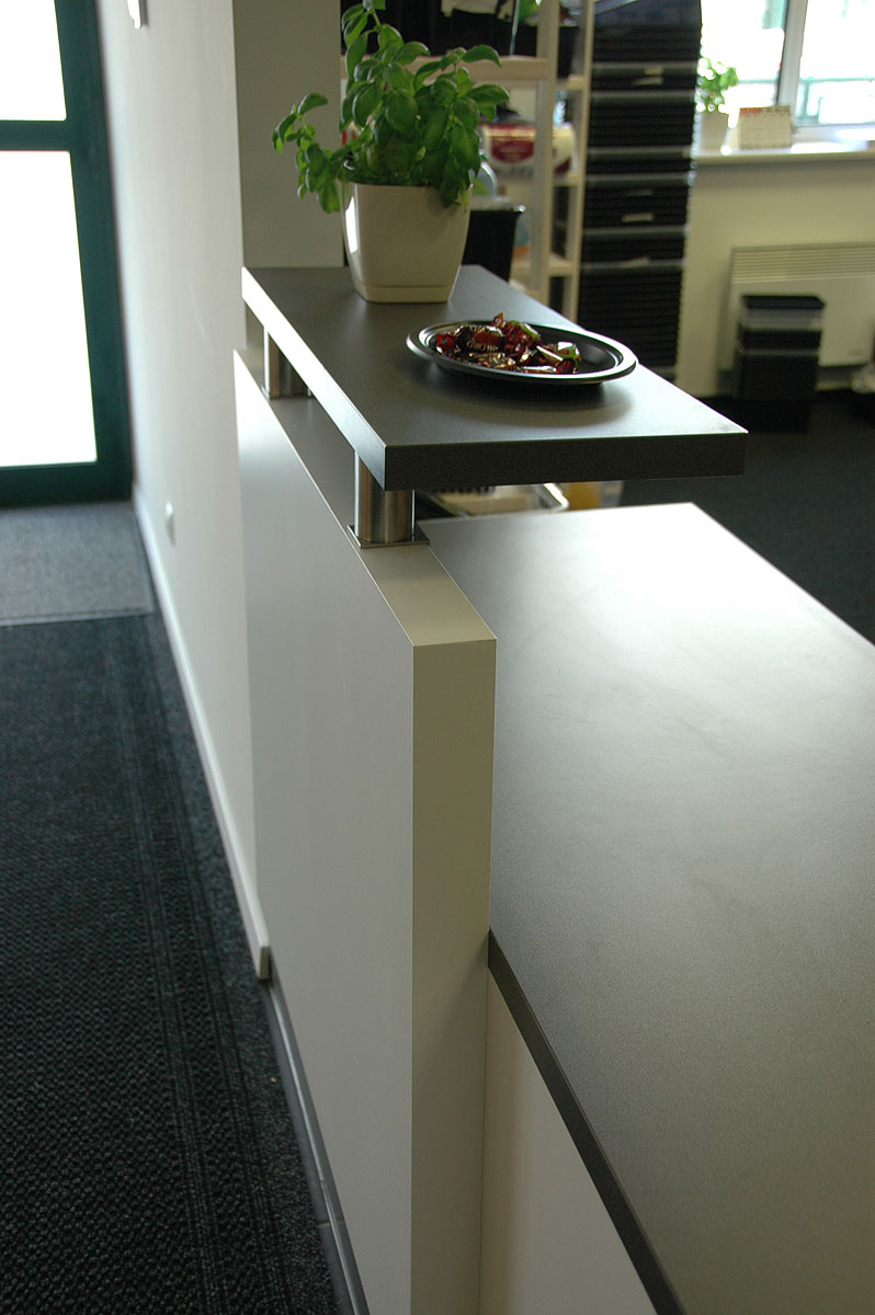 Przednie panele wykonane są z płyty o grubości 64 mm pokrytej melaminą, a krawędzie oraz cokół wykończone laminatemm HPL. Na łączeniach modułów blacha aluminiowa polerowana 3 mm.