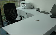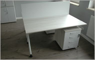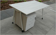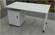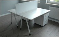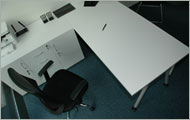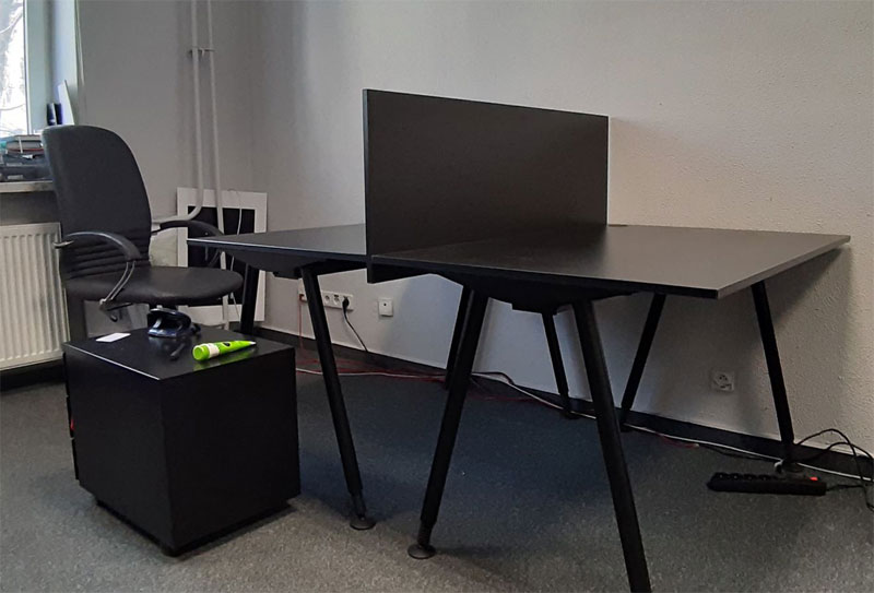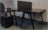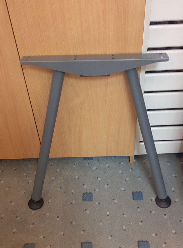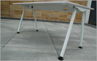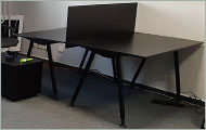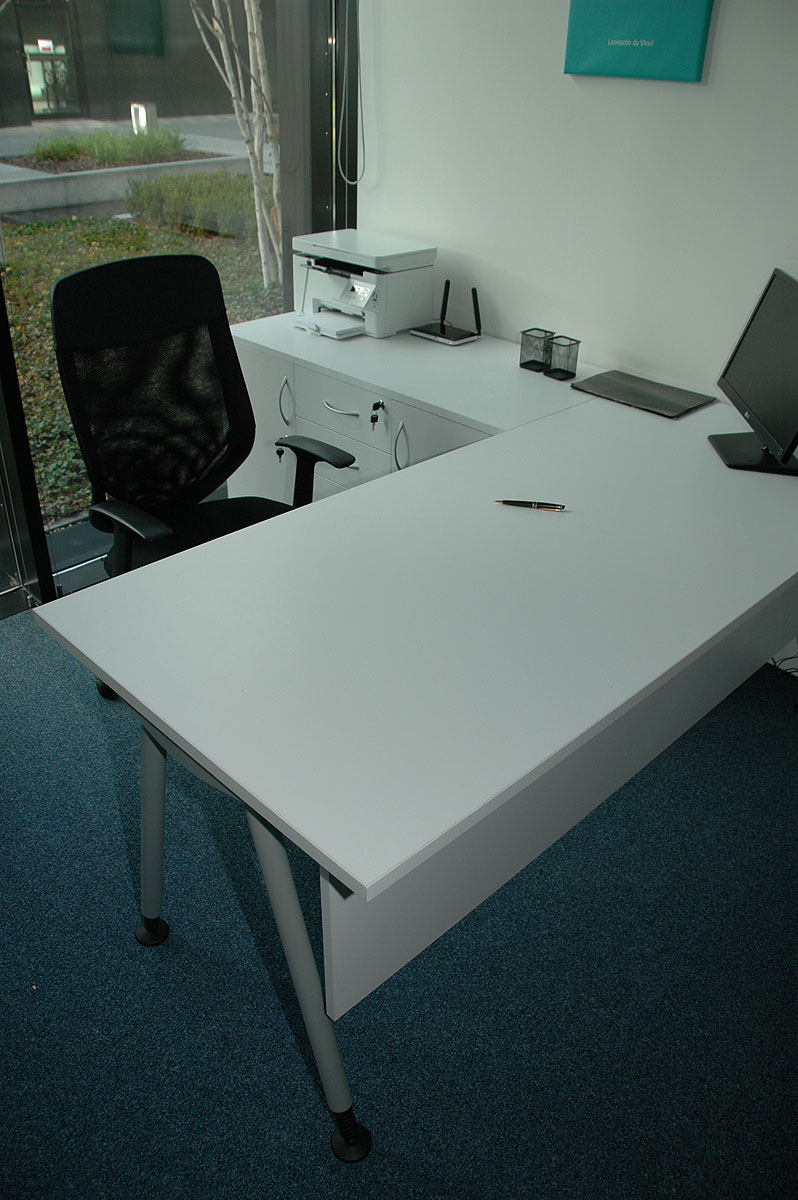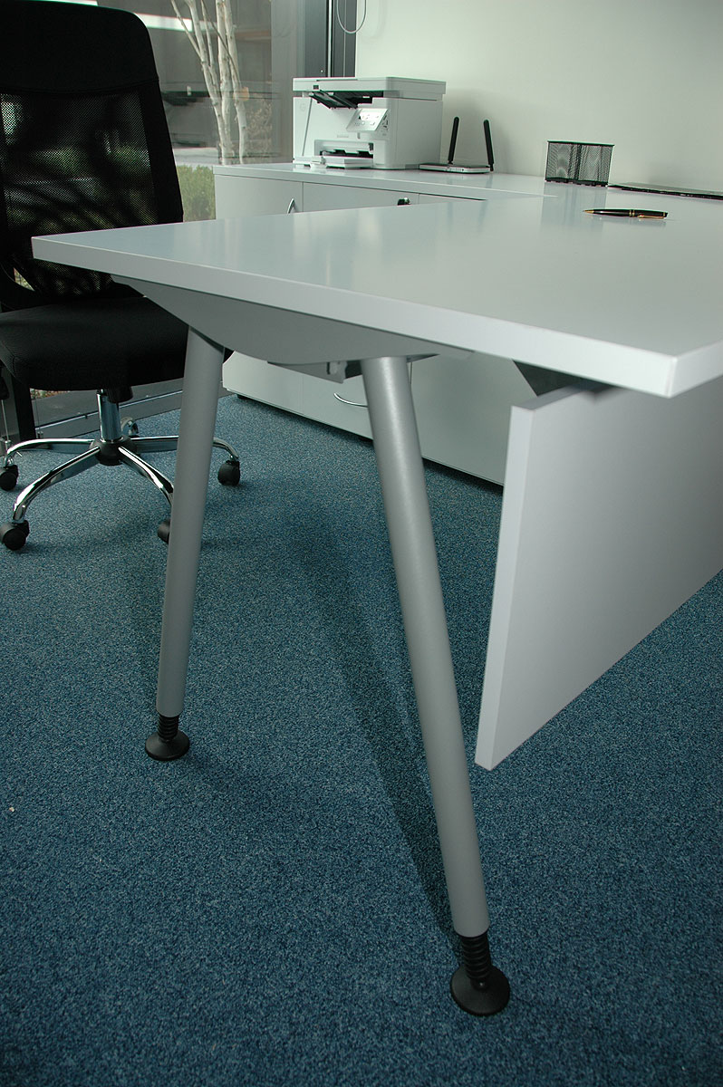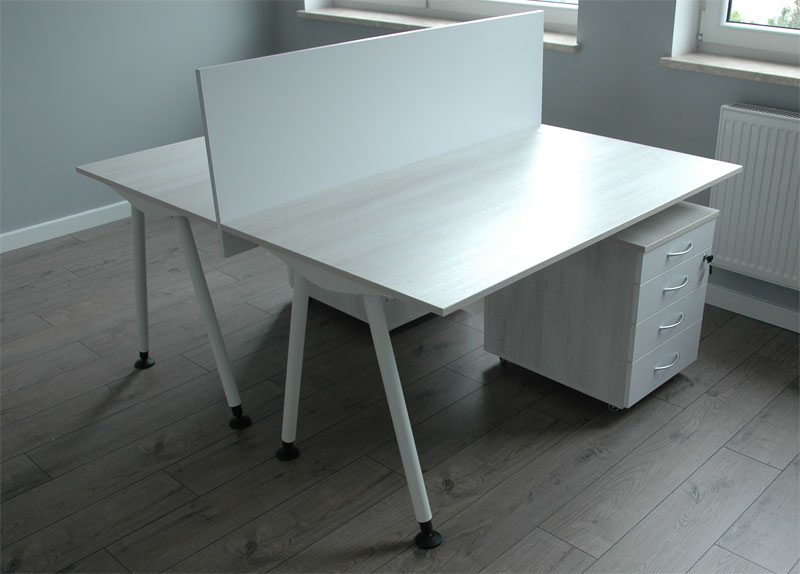 Biurka na stelażu metalowym z dwiema nogami w kształcie odwróconej litery "V". Blat w dwóch grubościach do wyboru: 18 lub 25 mm.