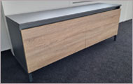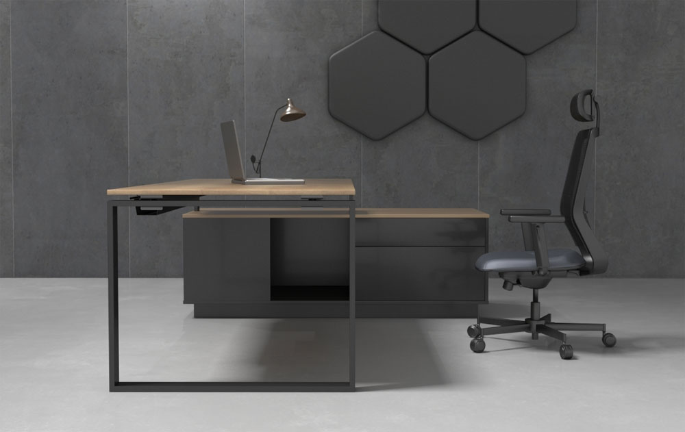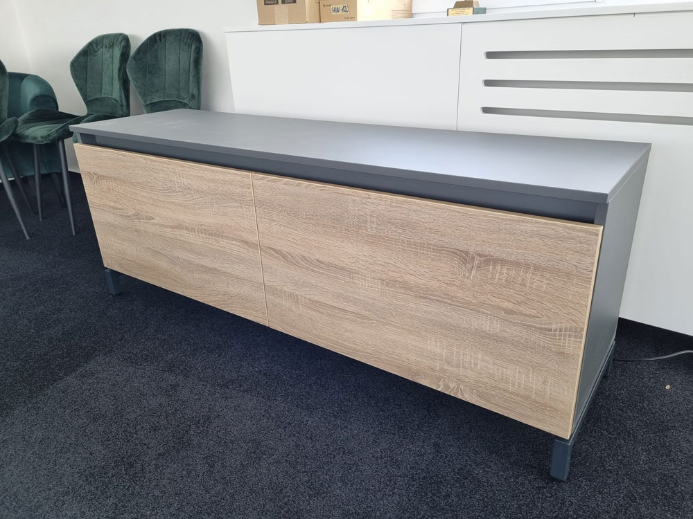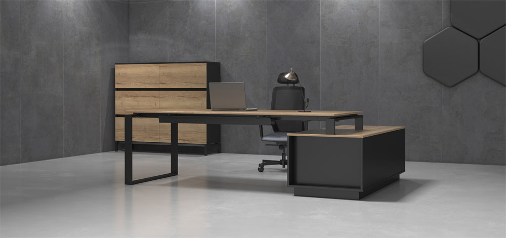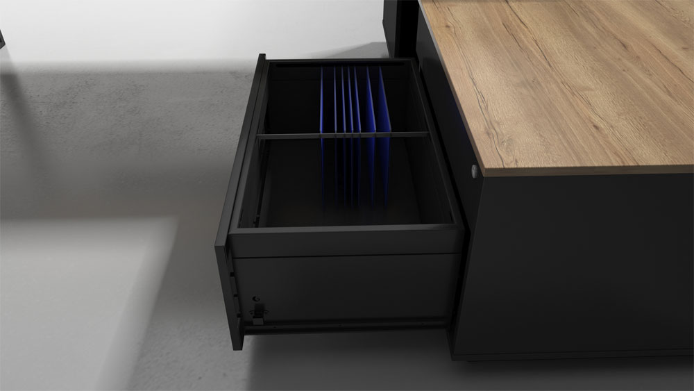 Meble gabinetowe carolina N to stelaż grafitowy w połączeniu z drewnopodobnymi decorami, ubrane w nowoczesną formę.