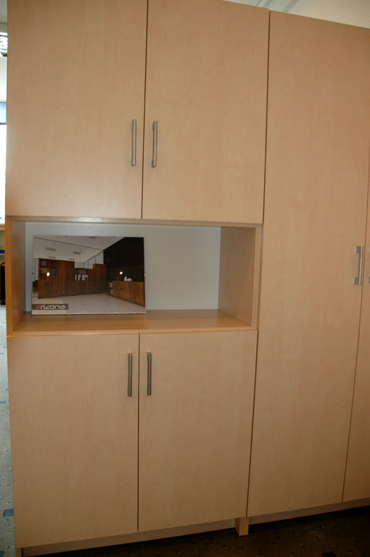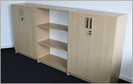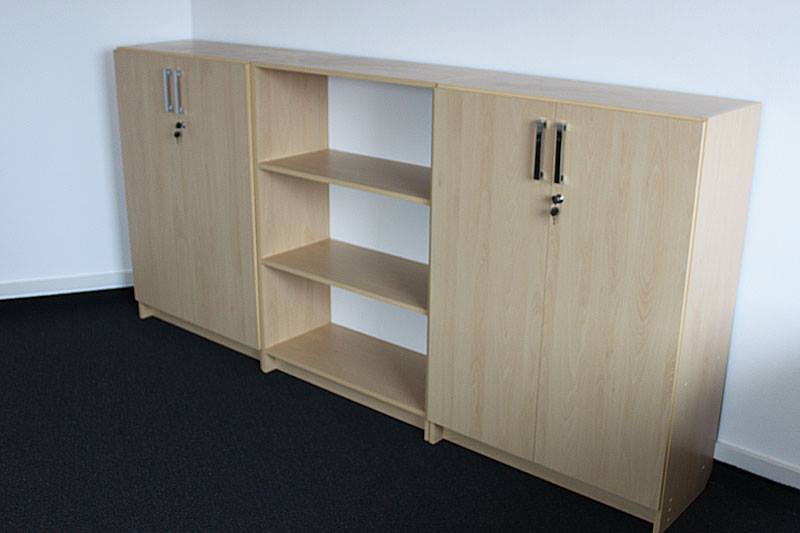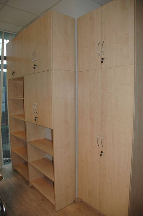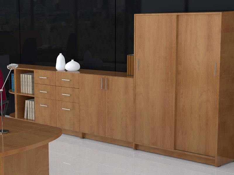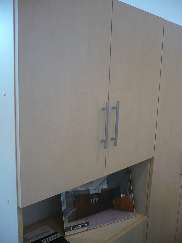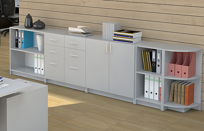 Regały arizona osadzone są na cokołach i ślizgaczach bez możliwości poziomowania wysokości. Prześwity segregatorowe, półki stałe, wieńce wpuszczane (w opcji nakładane o grubości 18 lub 25 mm). Zamki dodatkowo płatne. Korpus z płyty o grubości 18 mm, a plecy regałów z pilśni (hdf) w kolorze białym.