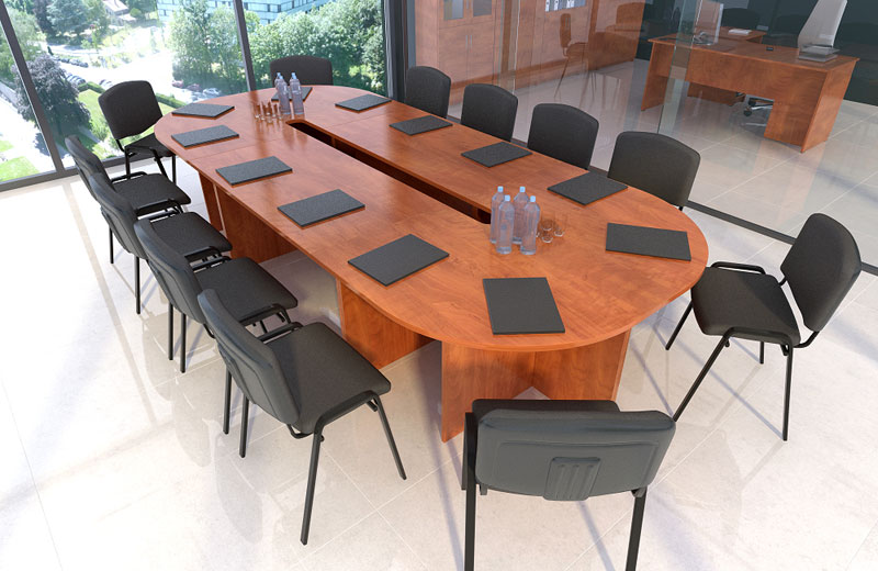 Stoły konferencyjne na nogach płytowych o grubości 18 mm osadzone na ślizgaczach. Blat o grubości 18 lub 25 mm.